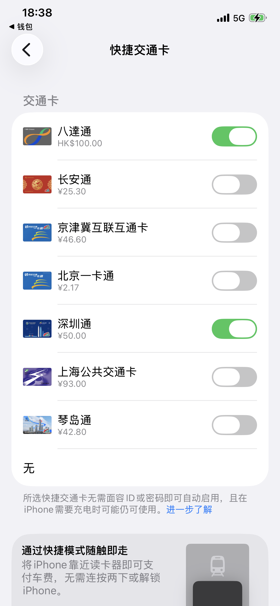 刚添加了一张香港地铁卡。 奇怪的是能和内地的地铁卡同时成为快捷交通卡。 内地的只能一张是快捷交通卡。