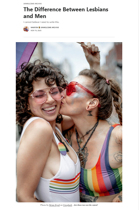 The Difference Between Lesbians and Men - The Right to Not See a Wiener I cannot believe I need to write this. MadFem ♀️ Unwelcome Archive https://substack.com/inbox/post/177841087 "Trigger Warning: meanie face TERF telling uncomfortable truths, unpredictable punctuation, unnecessary curses, and outright mockery Introduction and Inspiration Boys are Not Girls and Men are Not Women - The Most Important Point Attacks on Strangers by Men and Women Expanding the Category Versus Exclusion The Right to Not See a Wiener The Male Gaze The Assumption of Safety My Worries Introduction and Inspiration I recently made the mistake of bringing up the topic of my blossoming TERFdom with a couple of my friends. I should have known it would not end well, but I tend to forget that good arguments, facts, and figures are never enough to actually get anyone to think critically. I guess I also forget what sort of crazy-ass gender dystopia I’m living in. I was talking about the obvious problem with letting a middle school age boy self-select to change in the girls’ locker room by claiming he is transgender when one of my two friends said in response, “I know you’re not going to really like this, but this kind of reminds me when people were worried about lesbians being in the same spaces as women; that they were going to sexually harass or harm other women.” Excuse me. What was that? I was not prepared for this argument because I can’t conceive how these two situations are actually analogous. I just hadn’t considered that anyone would try to make a point like this, which left me without the words to form a proper response. I kind of lost my temper after that, I’m ashamed to admit. I figure that if my intelligent friend could believe such a thing made any amount of sense, surely other people could, as well. I’m ready to form my argument now. Buckle up. Boys are Not Girls and Men are Not Women - The Most Important Point I’m not going to play games with reality, nor consider this asinine assertion that men are not men because they say they are not. If you cannot live in a reality with objective truths, we cannot have a conversation about anything in earnest. In the interest of said truth, honesty, and a potentially fruitful discussion, I’m going to remind my readers of the reality in which we will proceed: A lesbian is a woman who is sexually attracted to other women. Trans-identified men (trans women) are not women. They are men who identify as women. Most of them are sexually attracted to women (because the majority of humans are heterosexual). Even if you believe there is a “gender identity” inside of people, trans-identified men are still biologically male, no matter the quantity or severity of the actions they’ve taken to feel or appear more feminine. They are men, and allowing them to enter women’s safe spaces means you are allowing potential predators into our spaces. Even if you’d like to argue that all trans-identified men are not predatory by nature of their “transness”, allowing males into our safe spaces makes it impossible for us to keep out the actual predators. Men, as a sex class, are a threat to us, and the best way for us to ensure they cannot hurt us in these spaces is to keep them all out, regardless of their “gender identity”. That’s not taking into account all of the real psychological damage already underway. (As Exulansic says, “Good men stay out so that bad men stand out.”) I find it genuinely frightening to see the impact this ideology has had on my friends and their capacity to think about this issue rationally. It is truly as simple as “they” said it would be: you change the definition of a word, reinforce that change, require people to talk about said subject to use the new language “correctly”, severely over-punish any dissent and bam! You have yourself a new fucking reality. It seems that my friends truly believe that these men are just misunderstood women. We all read the same dystopian novels in school. We were warned about these things. Don’t you guys remember?" Archived: https://archive.ph/ambbC *Note: #Exulansic did not coin the phrase "Good men stay out so bad men stand out" or "Gender Atheist." She stold both phrases from an Anon. She also does not have one single drop of Native blood. Exualnsic lies. #LesbiansDontLikeDick #LesbiansDontHaveDicks #MisgenderMeltDown #MaleSexualDepravity #TransvesticFetishism #YWNBAW #WomanFace #NotYourFetish #GenderBlackFace #NotYourCostume #AGP #Autogynephile #Autogynephilia #PeakTrans #TransCult #GenderAtheist #GenderWooWoo #DropTheT #GetTheLOut #SexIsNotACostume #WomenDontHavePenises #AntiMAP #KeepWomensSpacesSingleSex #SexNotGender #SexMatters #AntiKink #AbolishSissyHypnoPorn